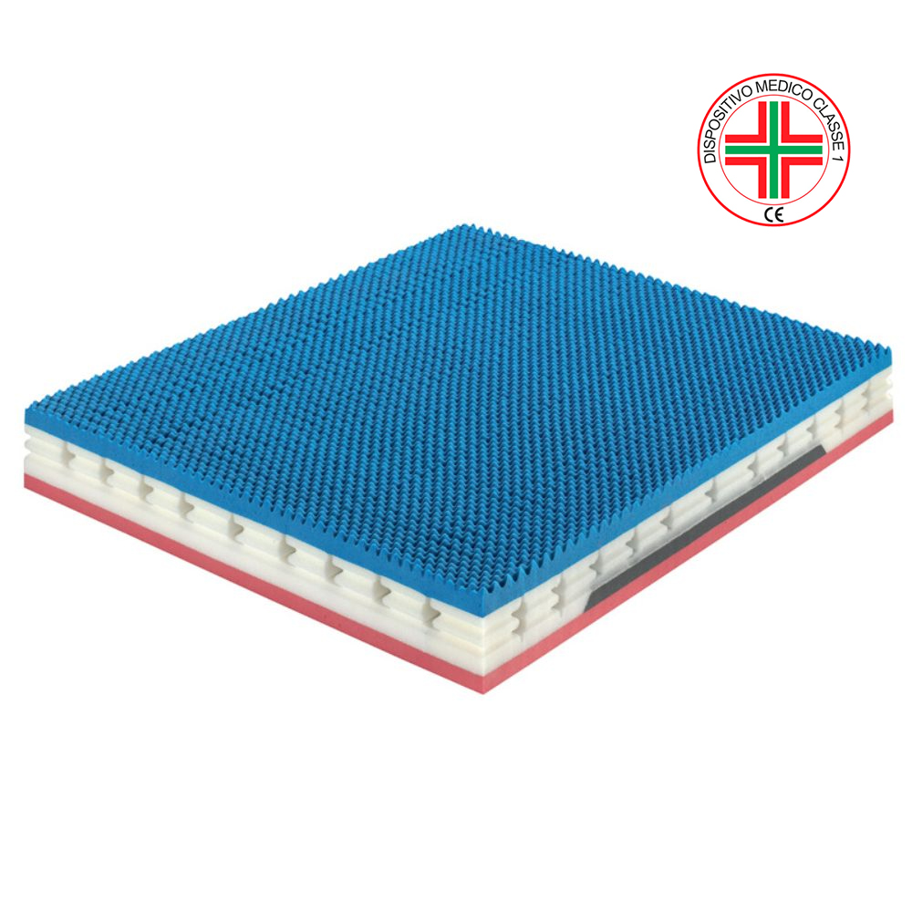 Il materasso è composto da una lastra superiore bugnata in Memory Gel viscoelastico di ultima generazione contenente microparticelle di gel che favoriscono la termoregolazione corporea e la circolazione sanguigna riducendo i punti di pressione.